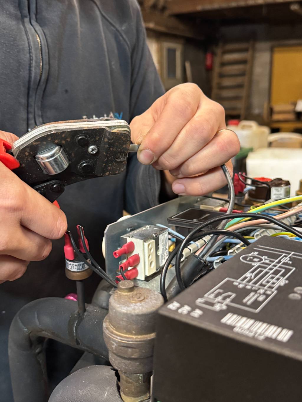 De retour sur site, la PAC a été remise en place. Les vases d’expansion ont été regonflés (900 g pour le circuit chauffage, 600 g pour le captage géothermique), puis la pression du réseau et l’appoint de glycol ont été ajustés. Le câblage électrique a été revérifié avant la remise en route.