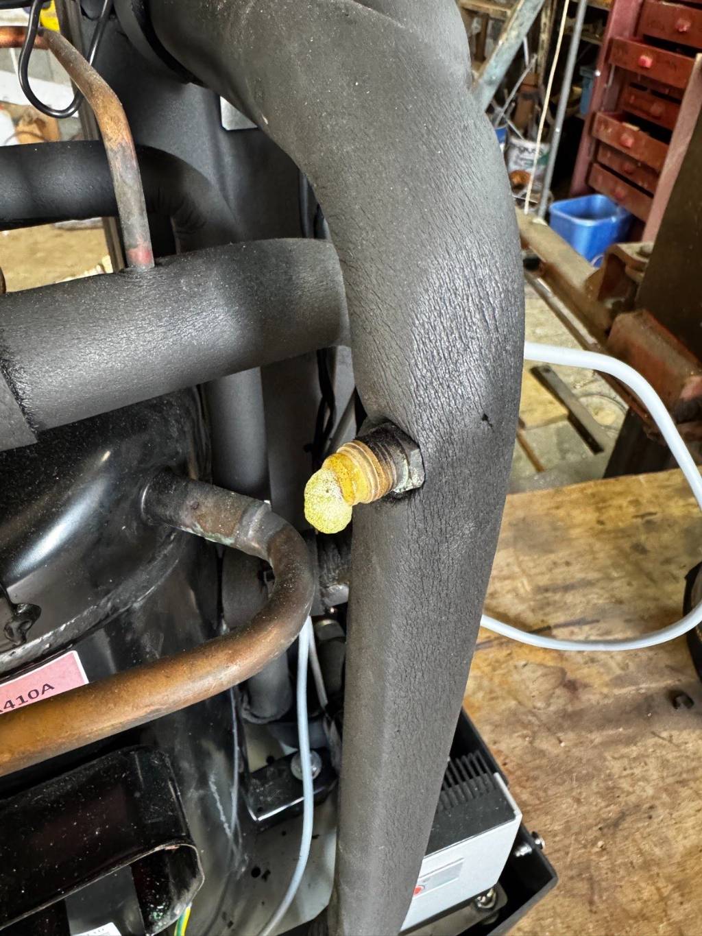 L’unité intérieure a été rapatriée en atelier afin de travailler dans les meilleures conditions. Le compresseur, pièce maîtresse du système frigorifique, a été remplacé, tout comme les valves Schrader. Le bouchon du détendeur a également été resserré pour garantir une parfaite étanchéité du circuit.